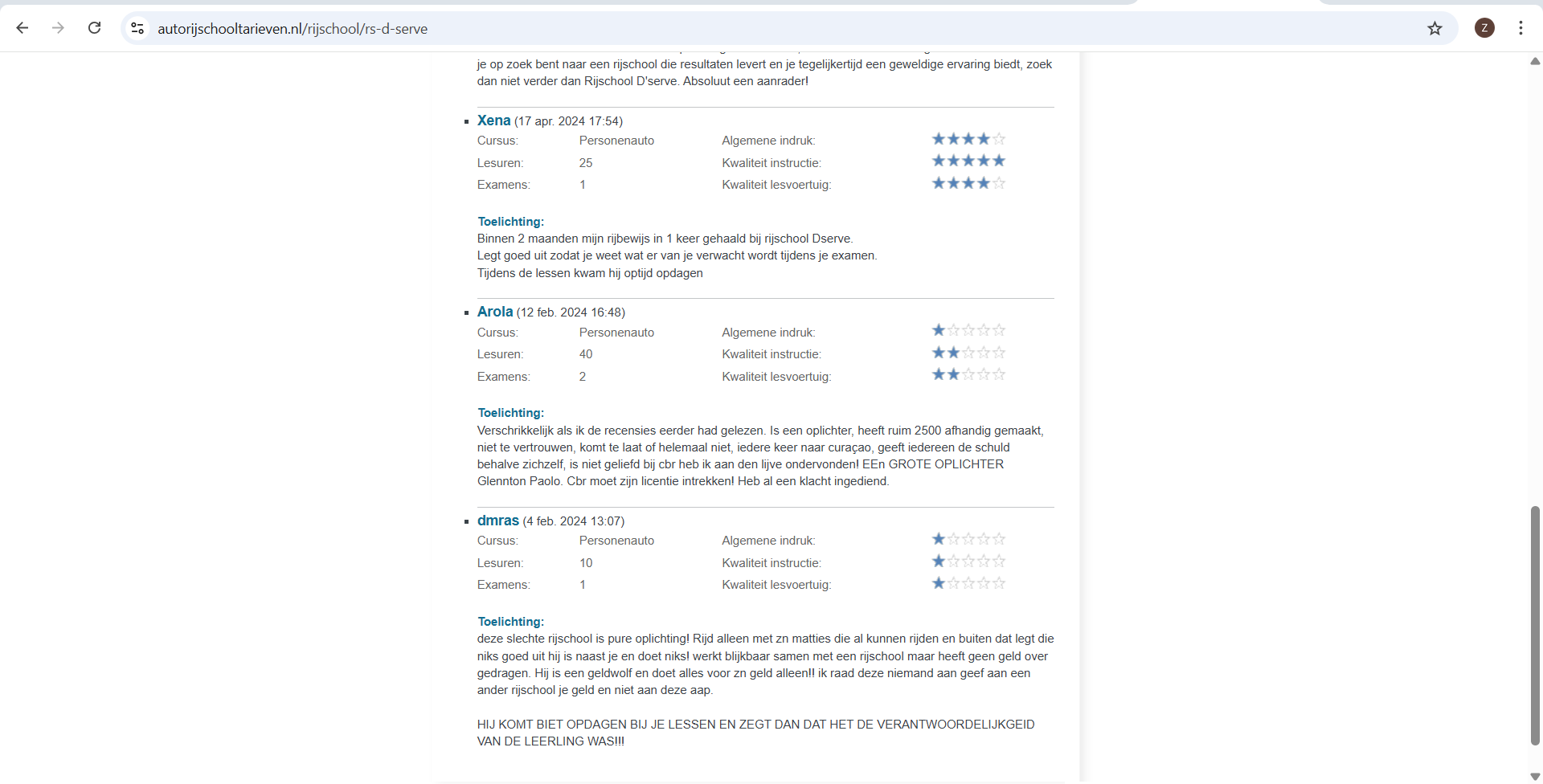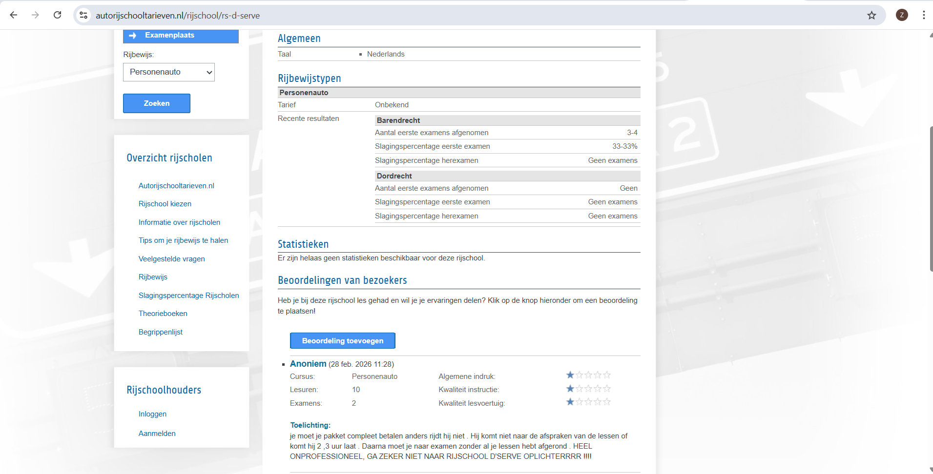 Op basis van drie onafhankelijke reviews, een CBR-slagingspercentage van 36% voor auto en 0% voor motor in 2025, en meerdere meldingen van niet-geleverde lessen na volledige betaling adviseren wij extra voorzichtigheid. Wij publiceren uitsluitend verifieerbare feiten.