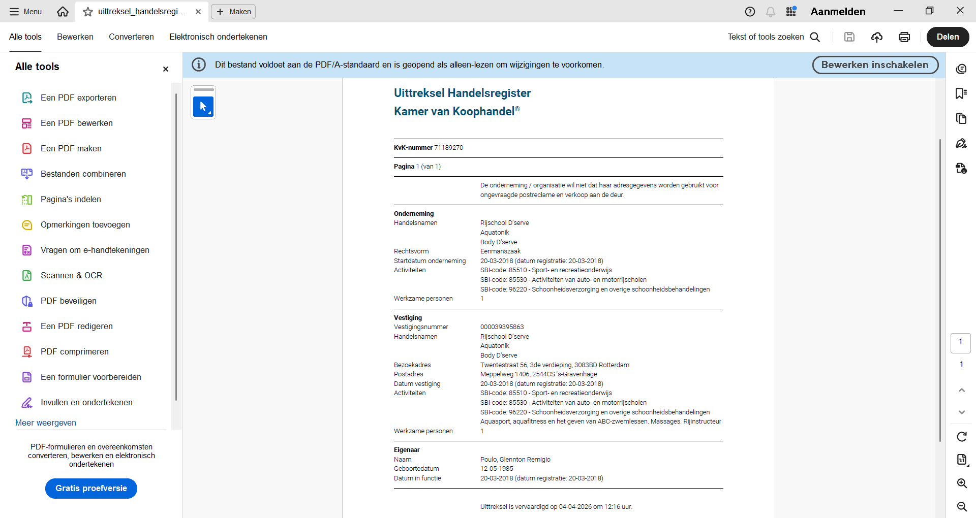 Dit is het KvK-inschrijvingsnummer van Rijschool D'serve. Onder dit nummer staan drie handelsnamen geregistreerd: Rijschool D'serve, Aquatonik en Body D'serve.